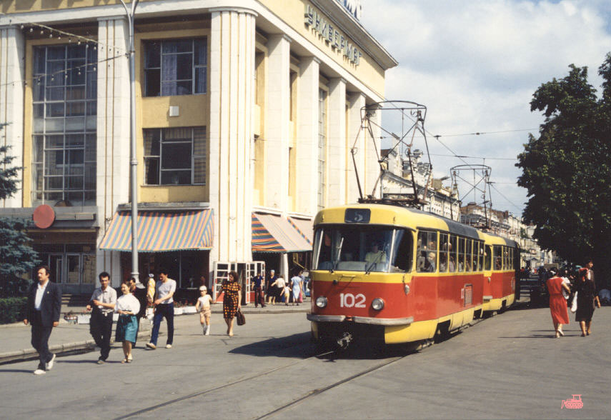 Центральная улица города – проспект Мира. Татры 102+103 на 5-м маршруте. Фото Marco Moerland, 27.6.1987. Тогда на линии работали только Татры Т-3. |