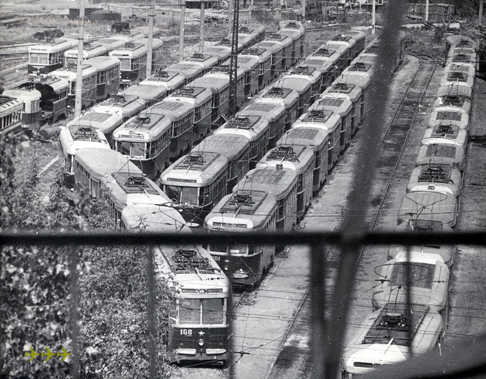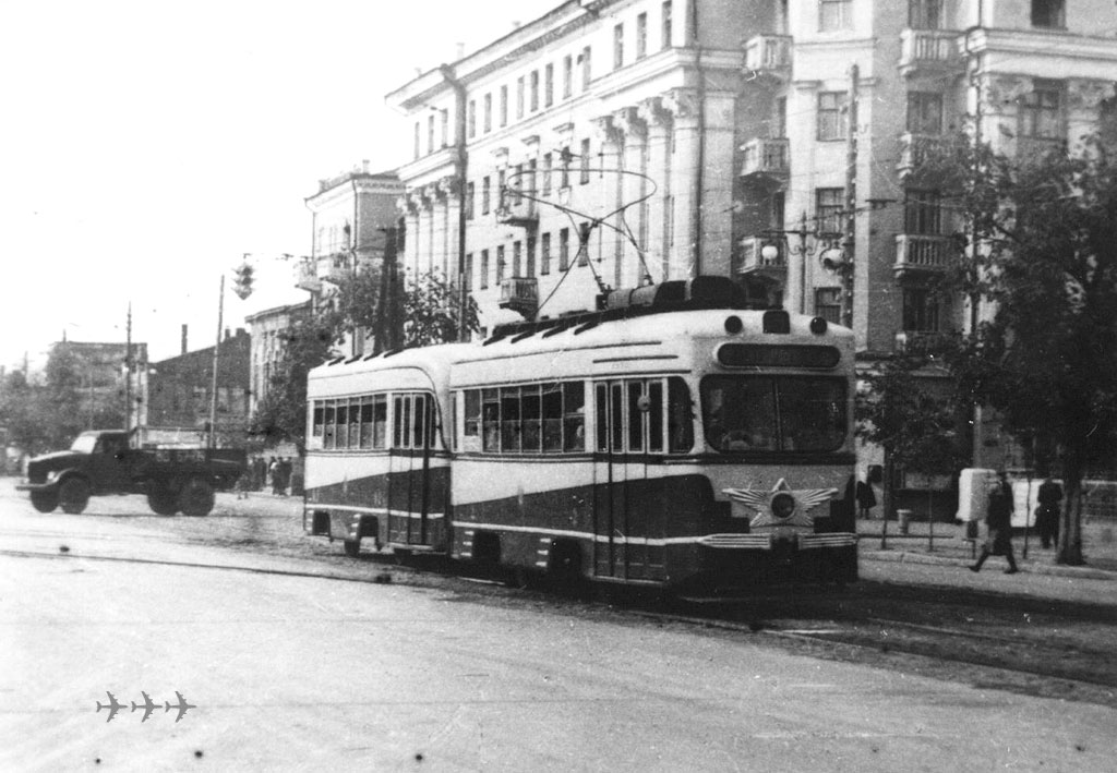 Вагонов КТМ-1+КТП-1 в Воронеже было 38 поездов, с номерами между 1+01 и 118+0118. Один из первых составов (1949 г.) – 5+05. Фото: Центральный архив кинофотодокументов СССР, 31.10.1953. |