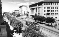 Вагонов Х в Воронеж поступило 70, номера 11-80. Фото: первый из них, №11, с прицепом М (№033?, один из 52, номера 011-062). Центральный архив кинофотодокументов СССР, 5.8.1950. |