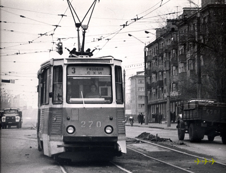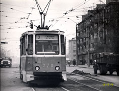 Депо №2 (? – распределение вагонов по депо до 1986 года пока неясно!) получил вагоны КТМ-5М №№224-250 в 1970 и КТМ-5М3 251-321 в 1975-76 годах. Последние оставшиеся из них в 1986 г. были переданы в депо №3. Фото: вагон 270 на 3-м маршруте; музей Воронежского ТТУ. |