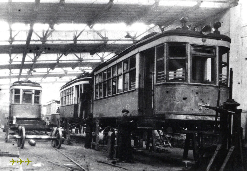 Ремонт вагонов Х и М в трамвайном депо после войны. Фото: музей Воронежского ТТУ. |