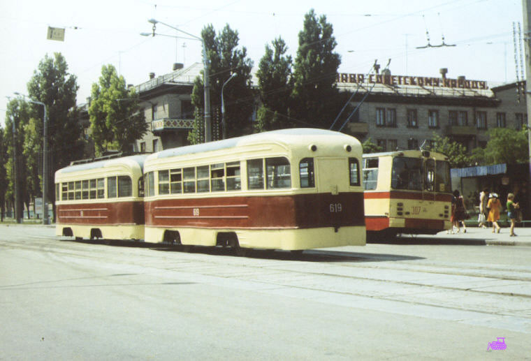 Поезд 119+619 типа КТМ-1+КТП-1 на поспекте Ленина, за ним троллейбус 307. Фото Volker Vondran, 1979. В задней стенке вагона КТП-1 было место для двери – для перевозки раненых в войне. |