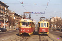 Поезда 711+712 на 2-м и 388+389 на 4-м маршруте. С этой (северо-западной) части проспекта Ленина трамвай скоро должен уйти. Фото Константин Климов, апрель 2002. |